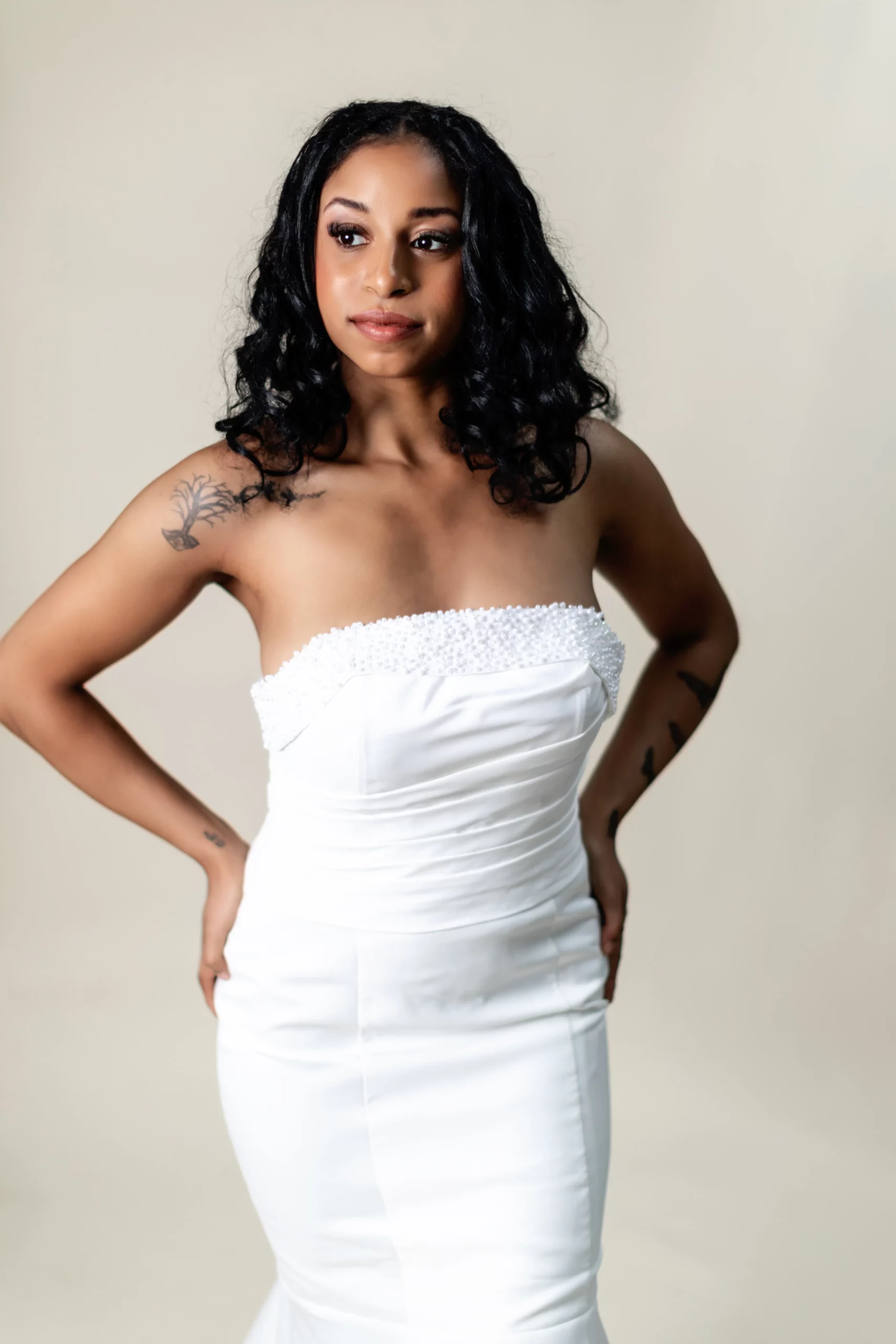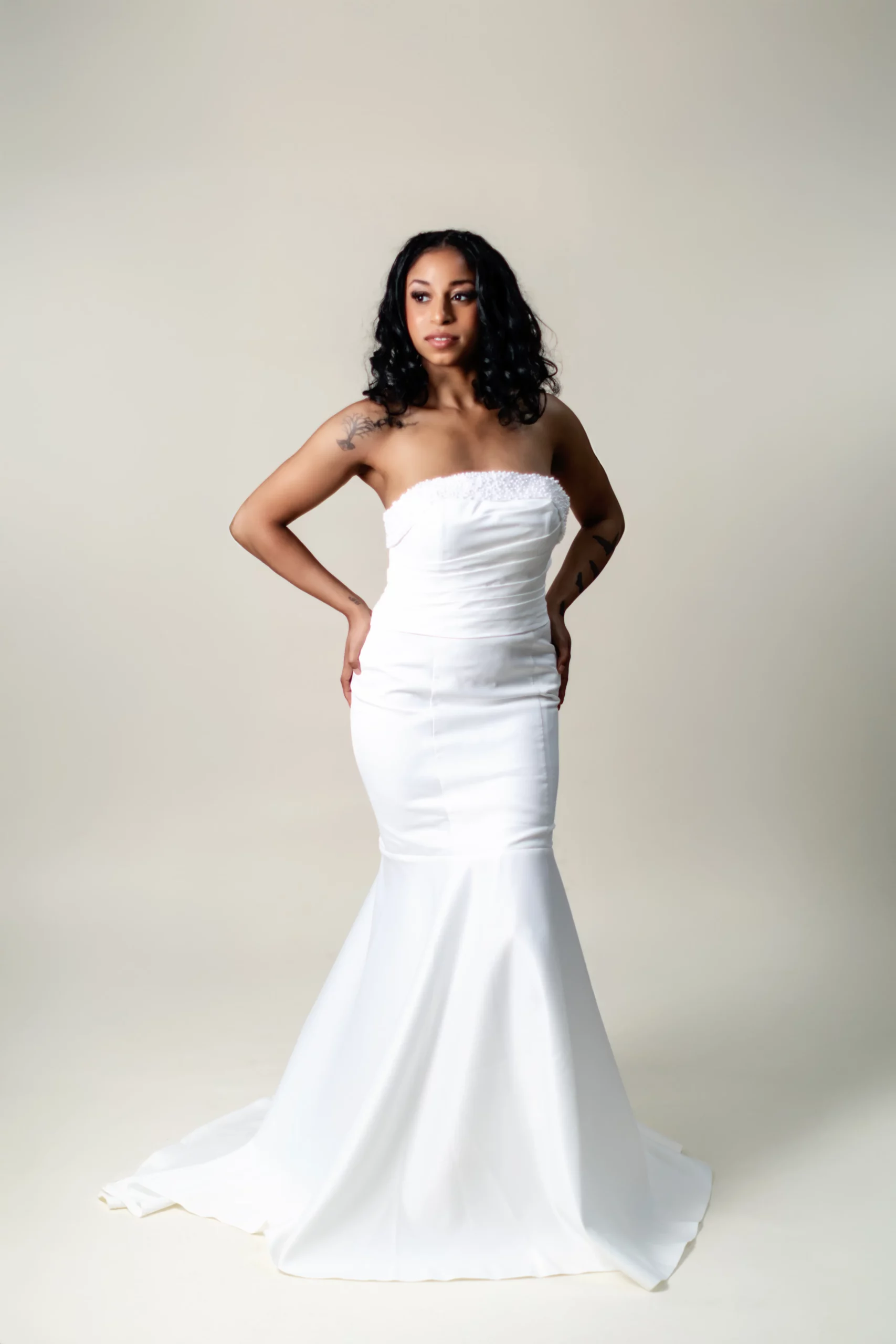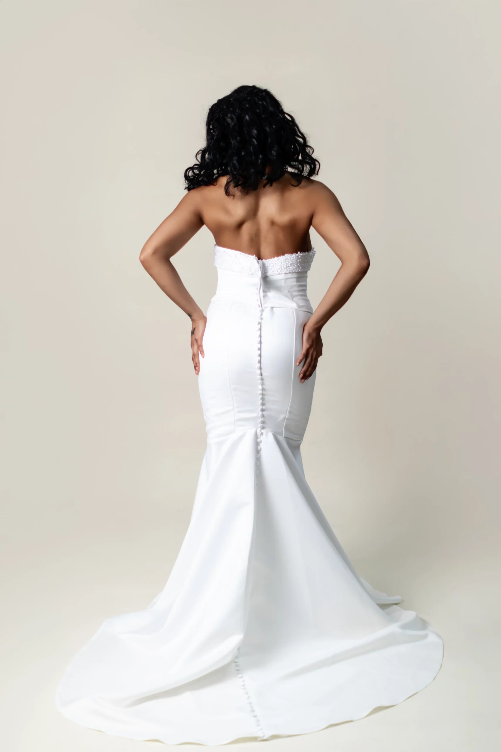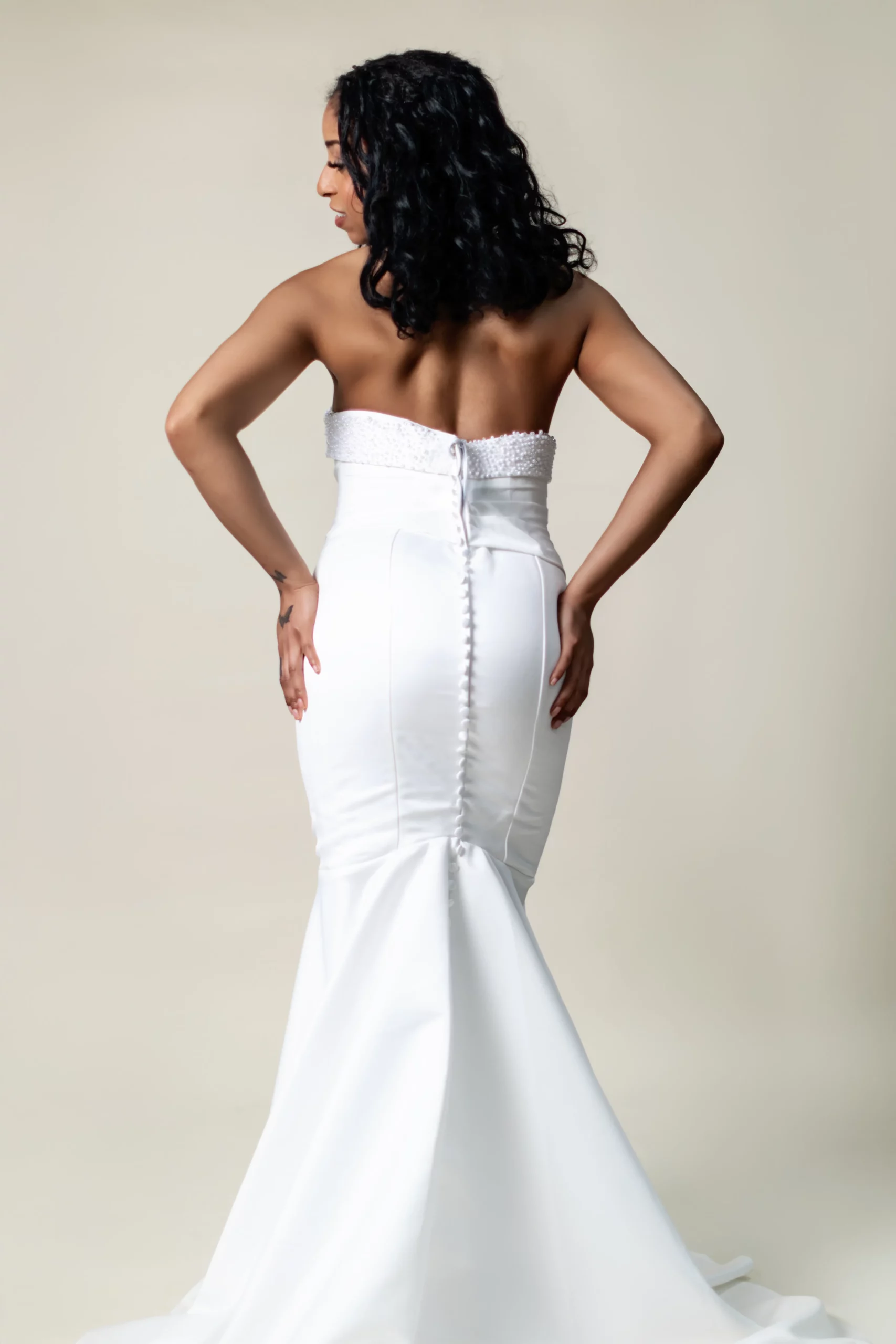 A sleek strapless satin mermaid gown with a pearl-beaded neckline and button-down back detail. Aisha is timeless, clean, and confidently elegant, designed for the modern bride.