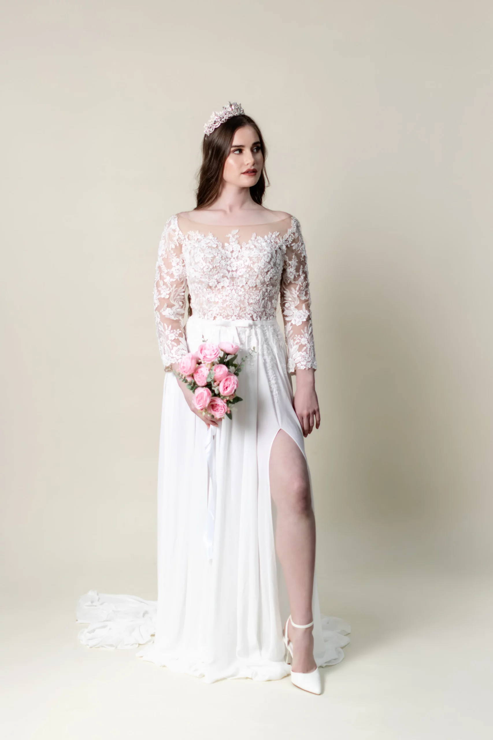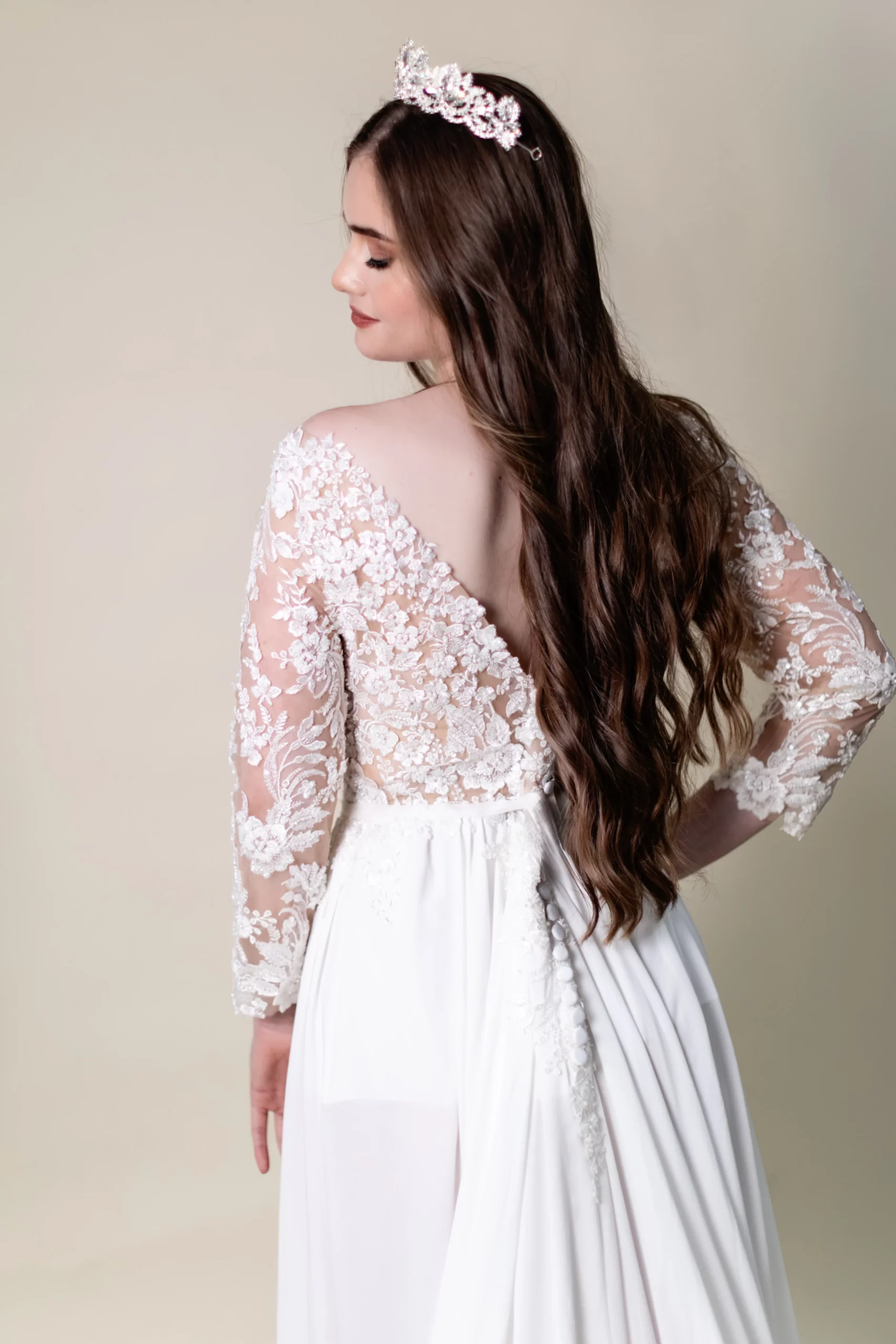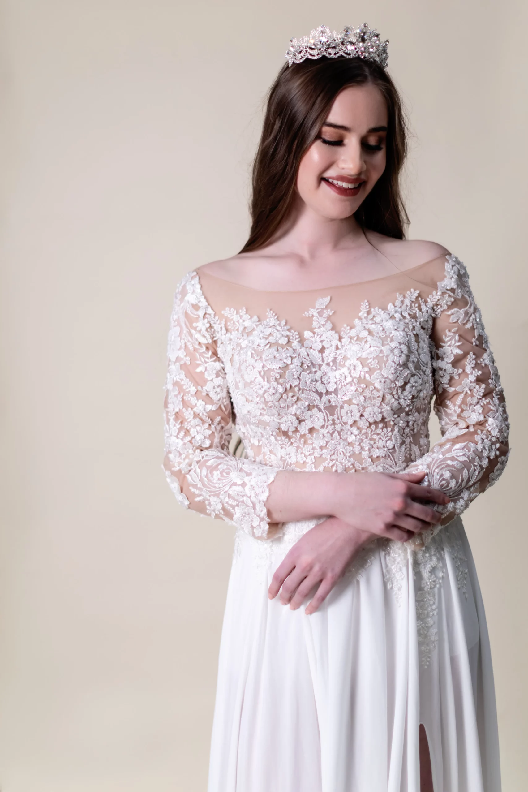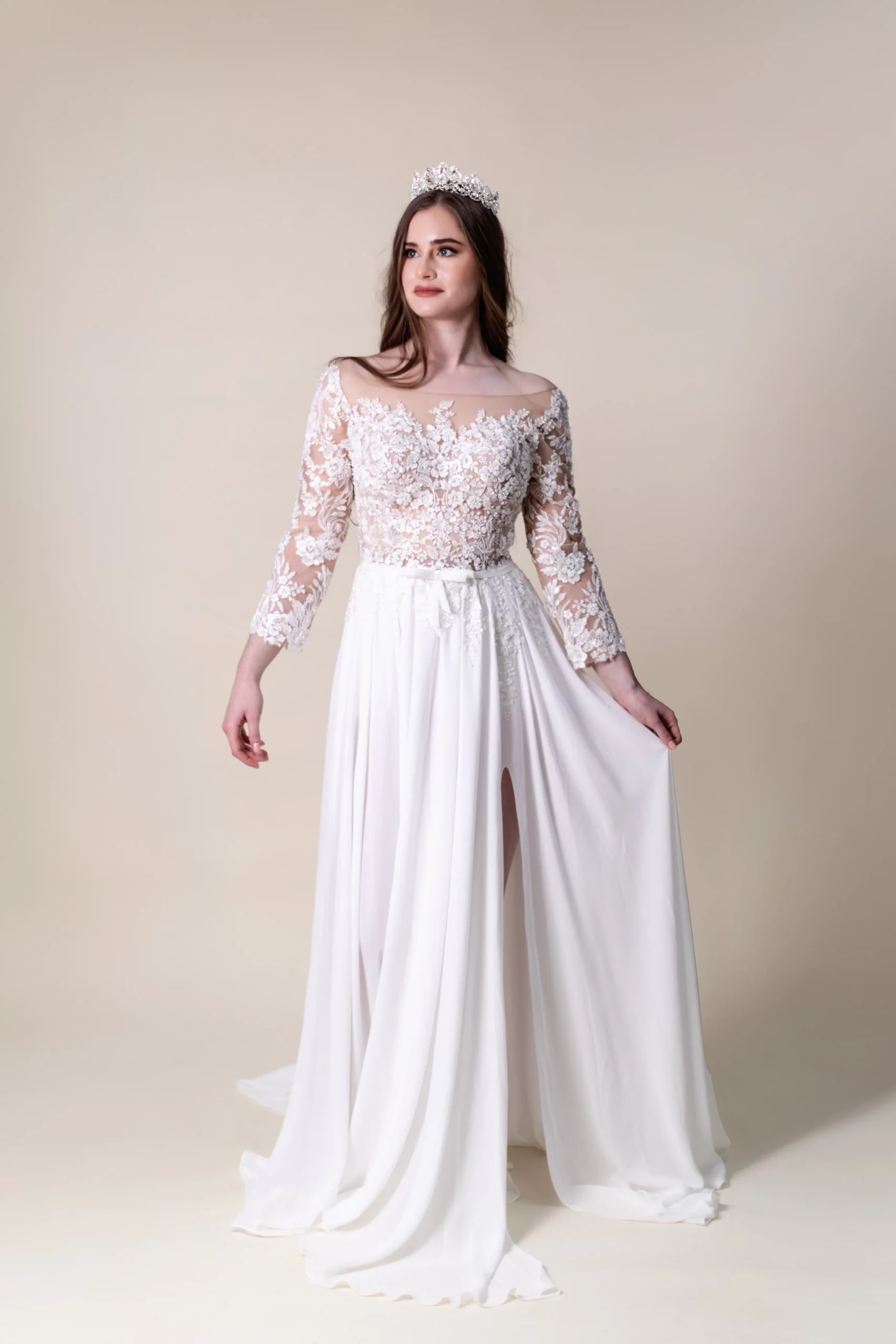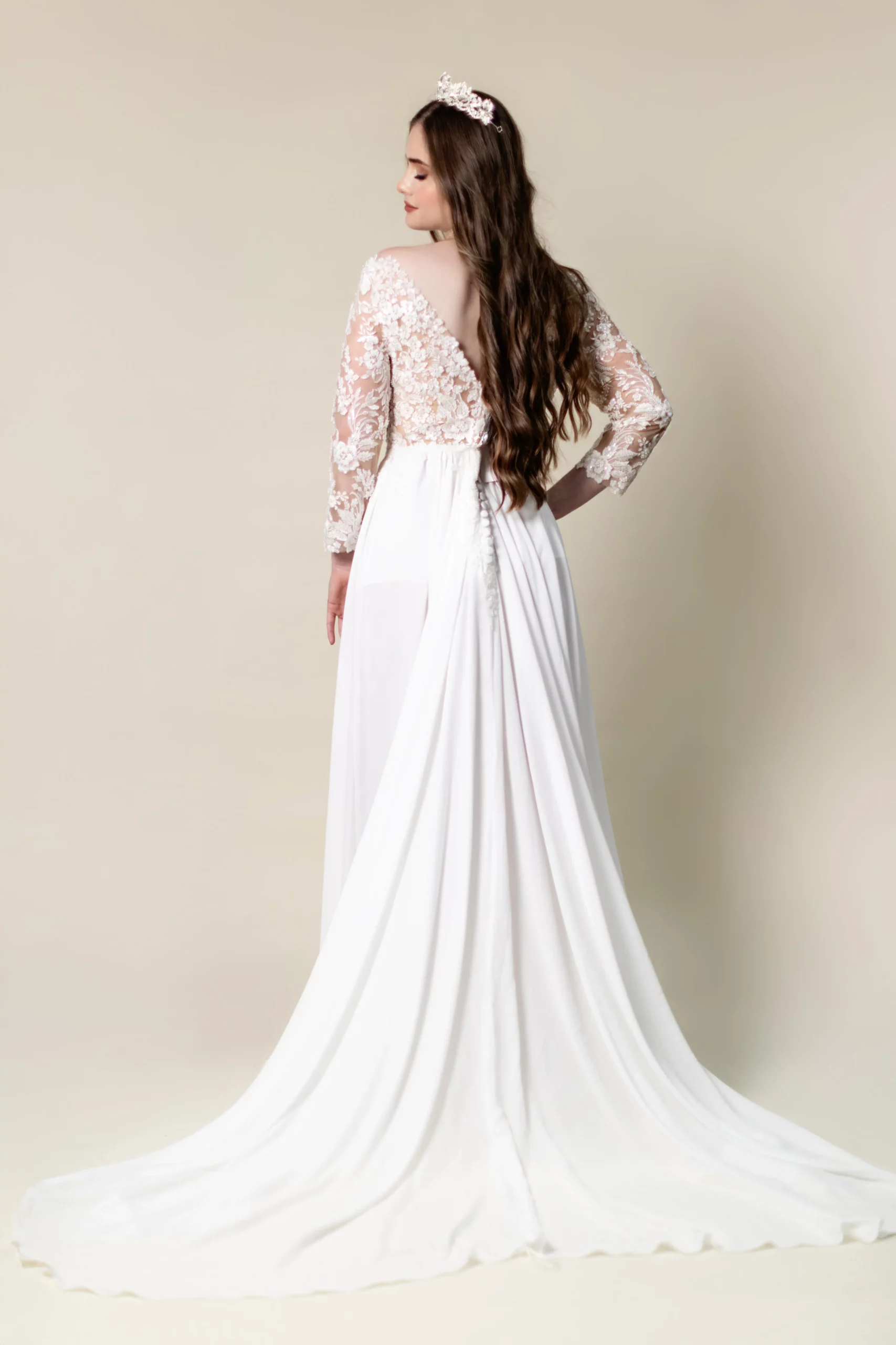 Claire is the embodiment of timeless elegance and effortless grace. This enchanting gown features a delicately embroidered lace bodice with sheer long sleeves, creating a romantic and refined look. The illusion neckline highlights intricate floral lacework, while the soft chiffon A-line skirt cascades gently into a flowing train, offering both comfort and drama. Designed for the bride who wants sophistication with a touch of ethereal charm, Claire flatters every figure with its light movement and detailed craftsmanship.