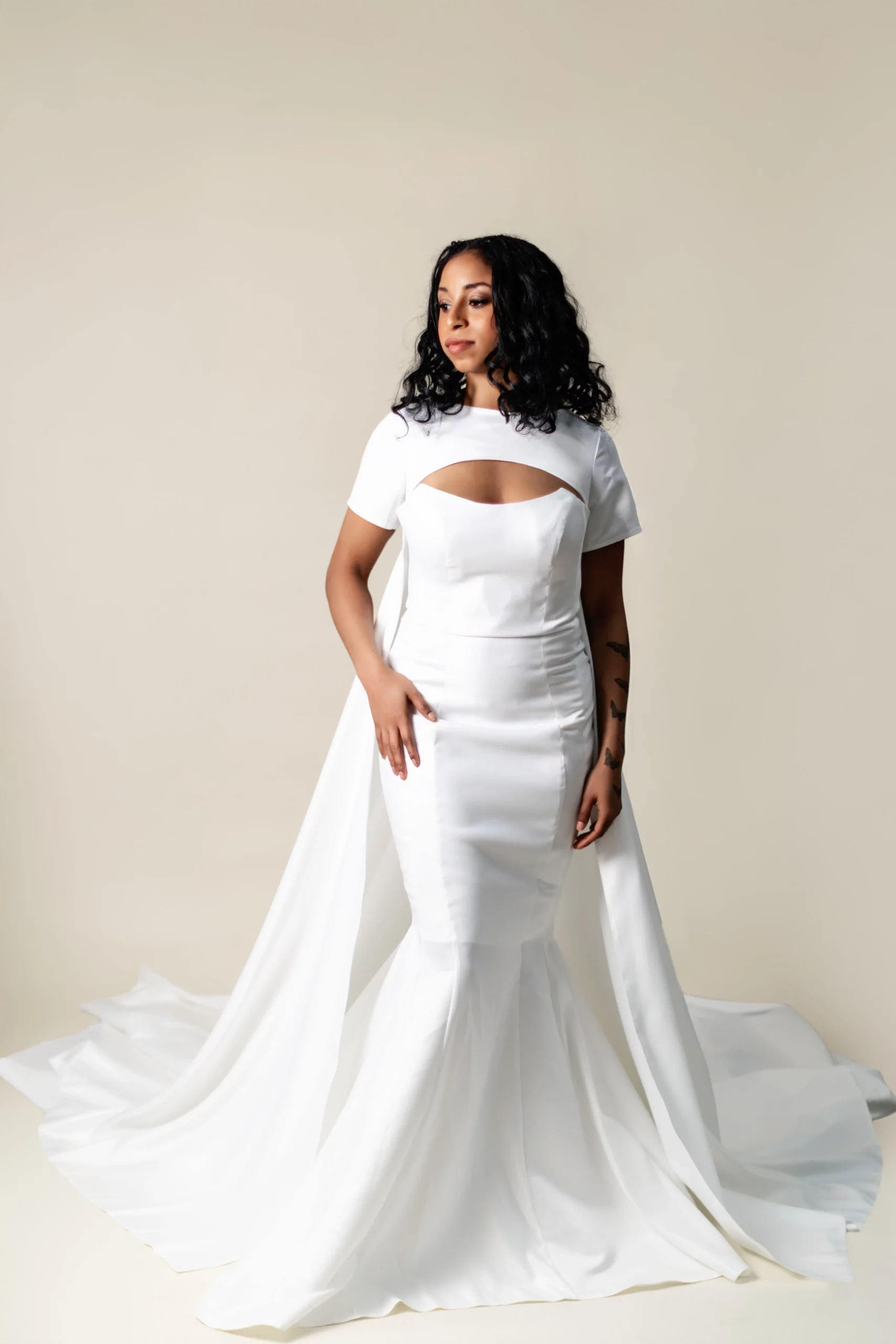 Turn heads in the timeless elegance of our Jane gown, a modern masterpiece for the confident bride. Crafted from sleek satin, this gown features a chic strapless neckline and a curve-hugging mermaid silhouette that celebrates your figure with sophistication.
