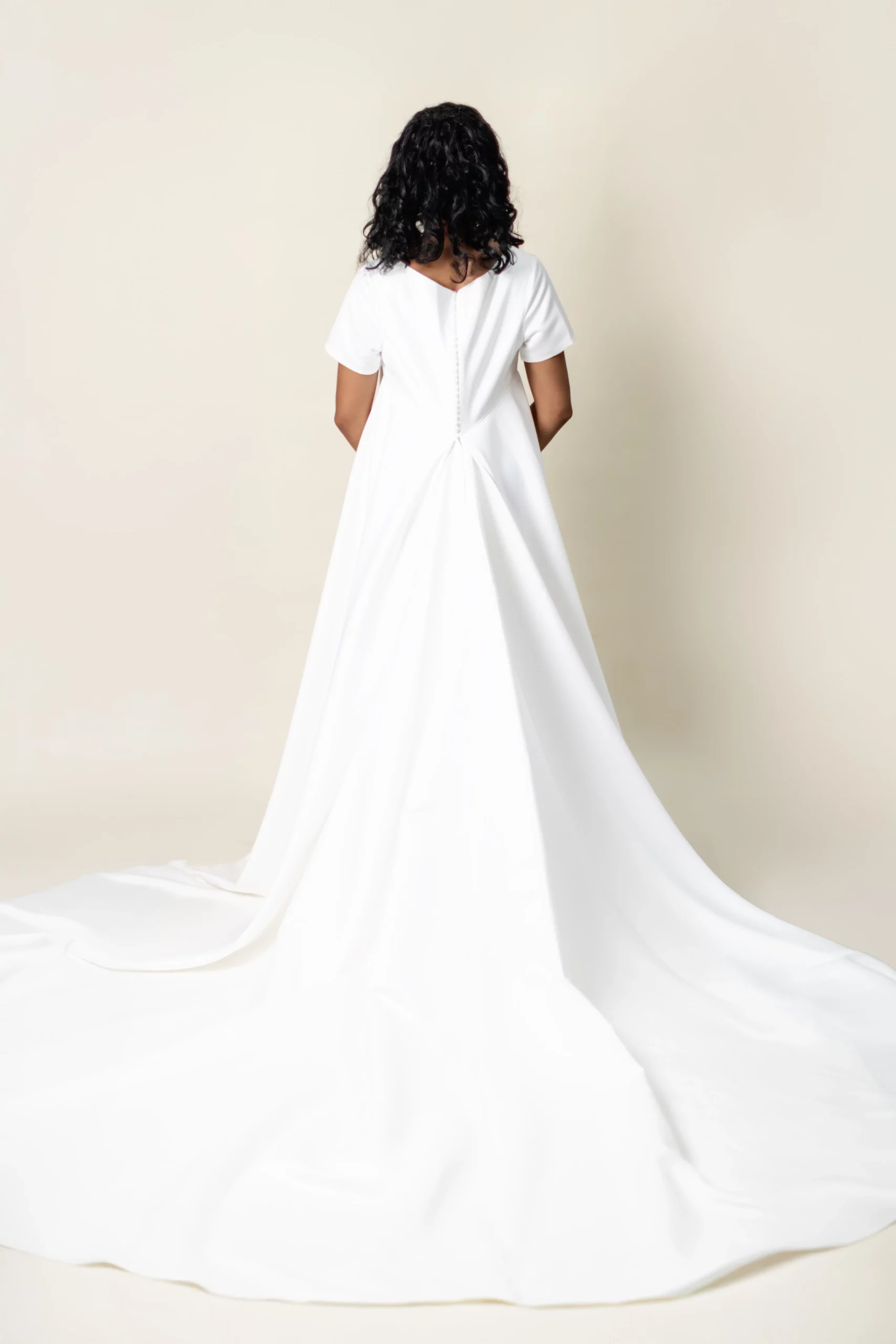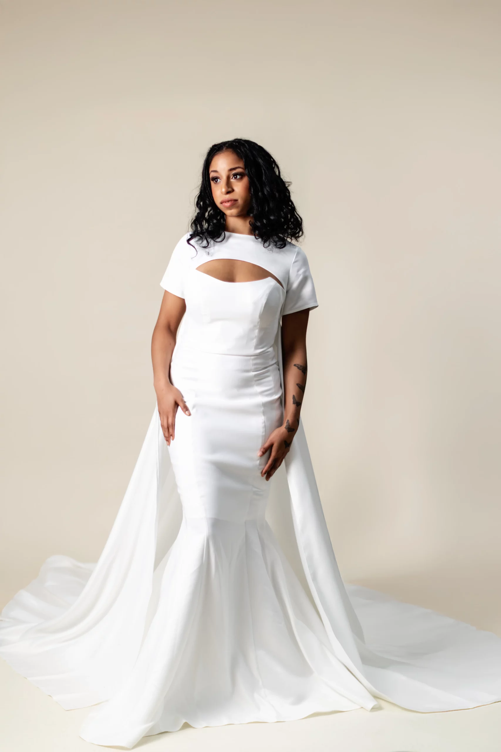 The show-stopping element is the detachable cape-style train, which adds drama and versatility to your bridal look. Wear it for a regal, cathedral-inspired entrance, then remove it for effortless movement at the reception.