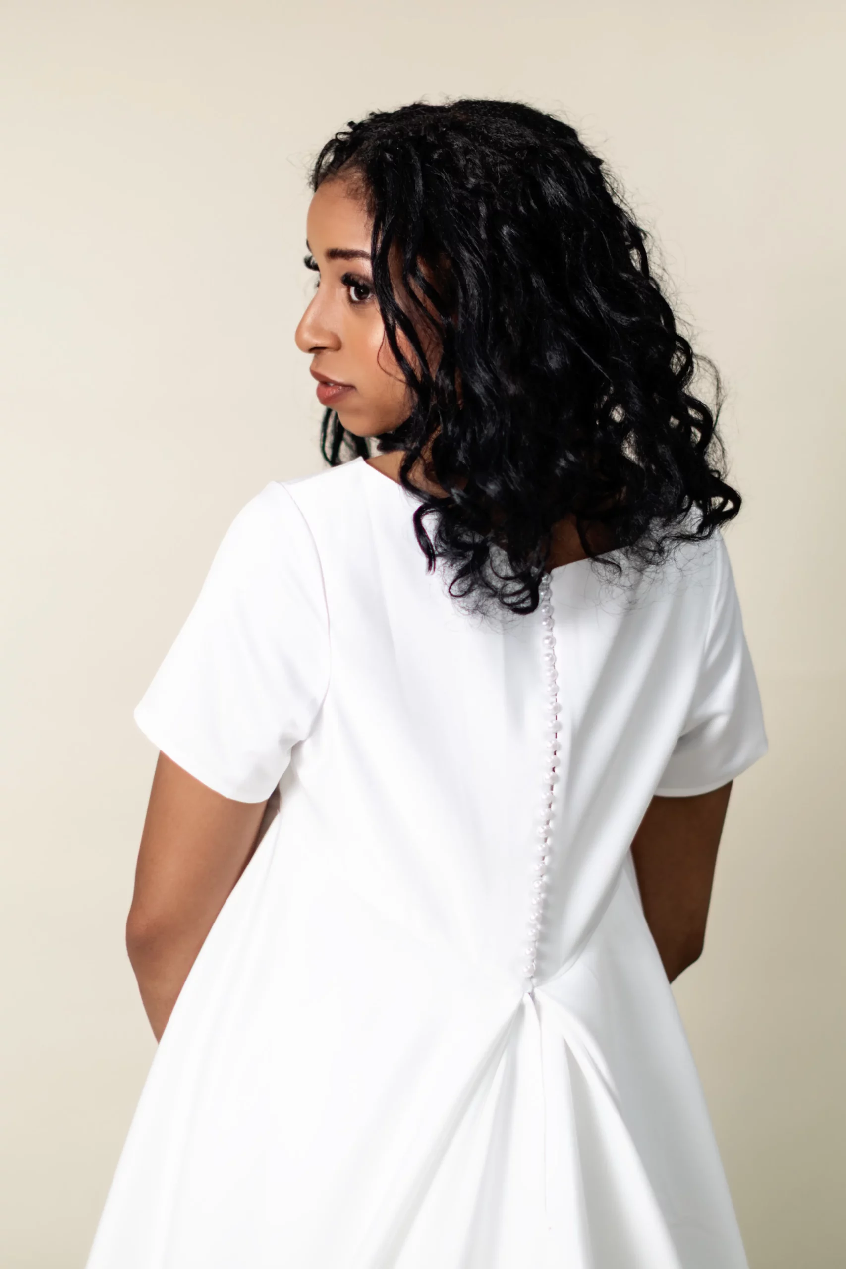 Delicate satin-covered buttons cascade down the back, adding a refined finishing touch to this contemporary yet classic design. Whether you’re walking down the aisle or dancing the night away, Jane offers two stunning looks in one unforgettable gown.