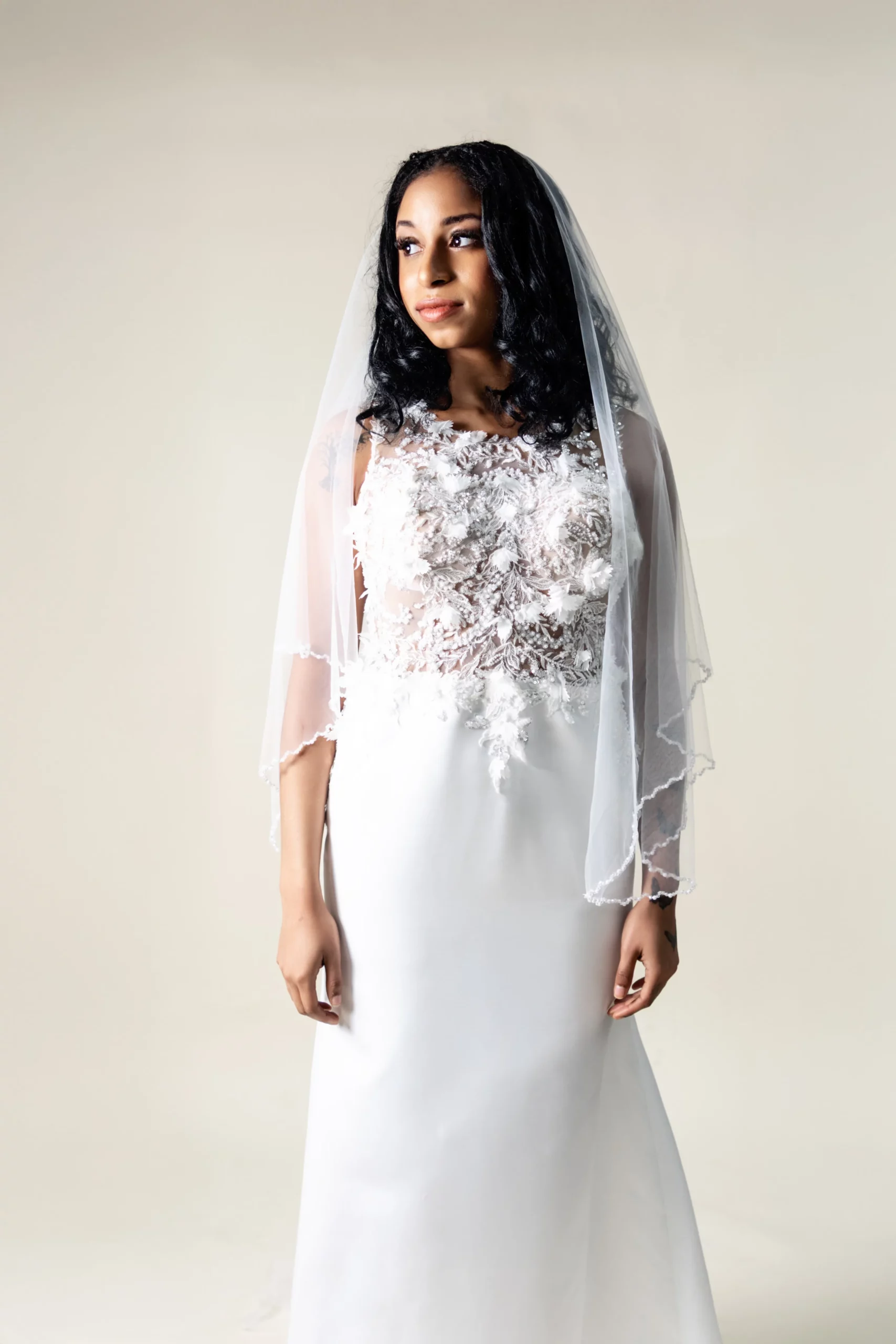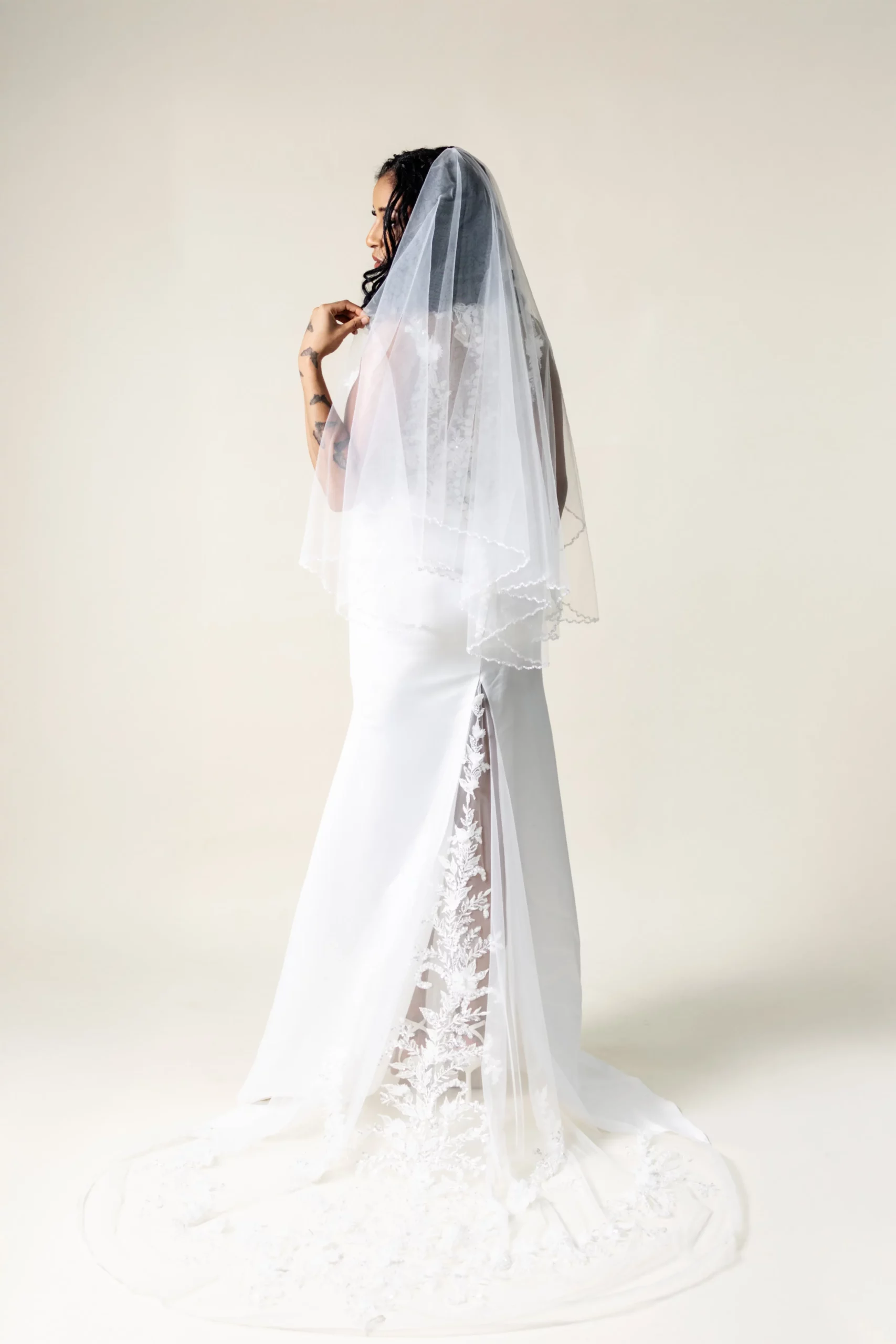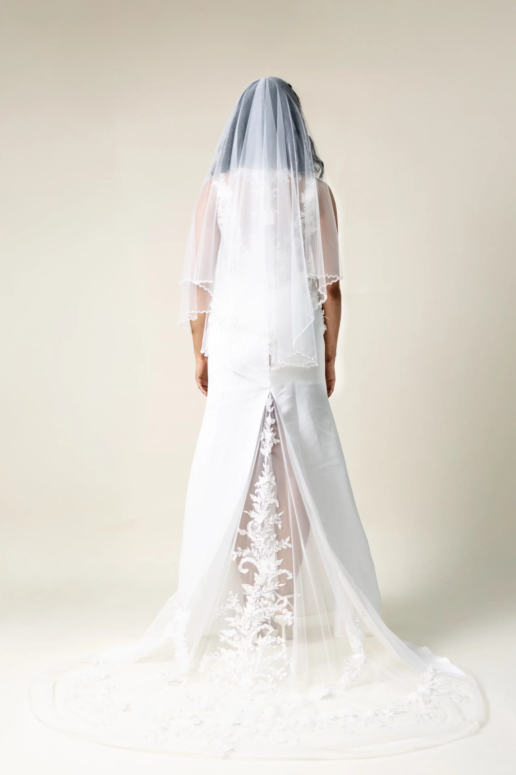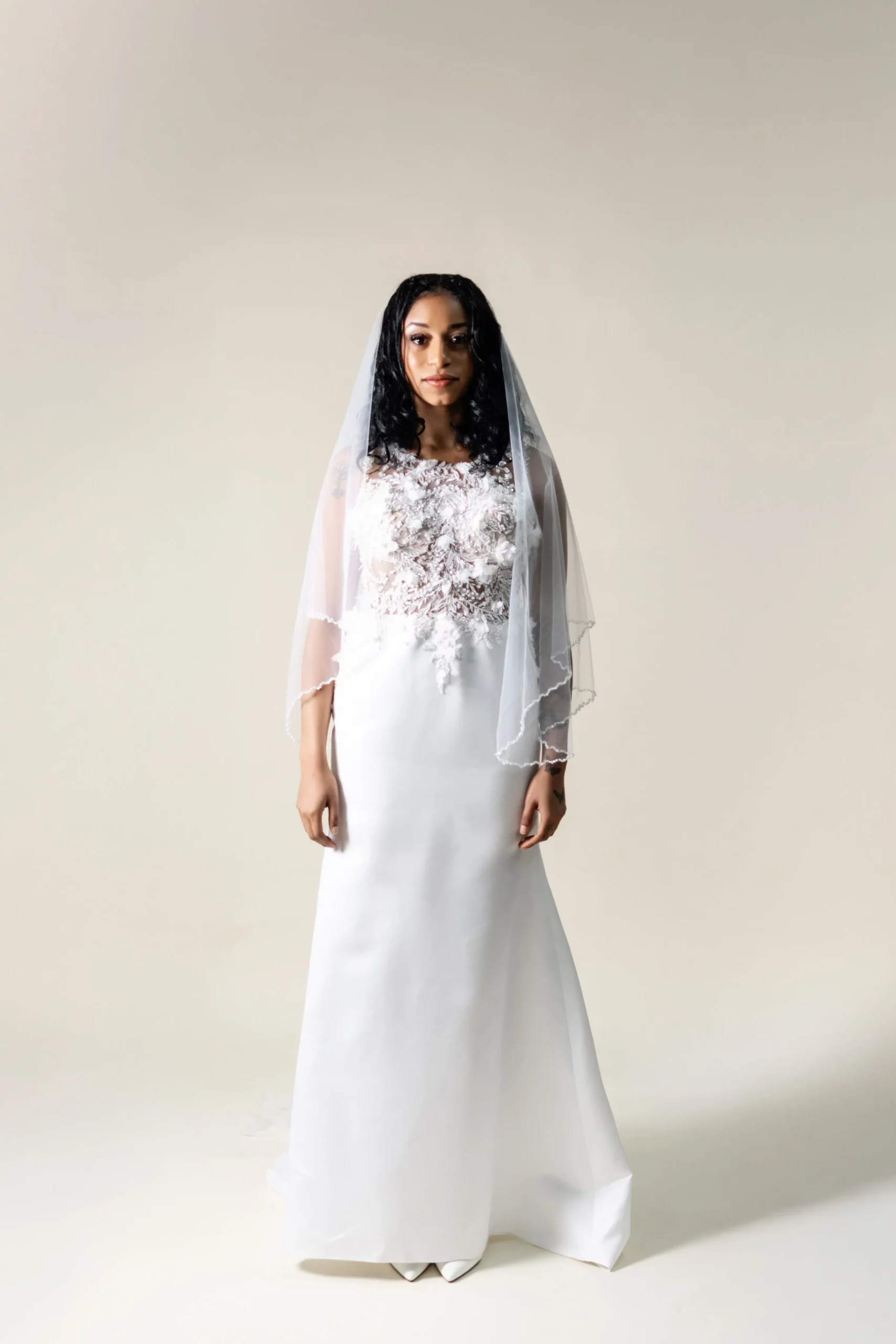 The fit-and-flare satin skirt elongates the body with a clean, smooth finish, leading to a breathtaking illusion lace panel in the train, a statement detail that ensures a stunning exit. Paired with a layered fingertip veil edged in beadwork, Juliana delivers an unforgettable aisle moment.