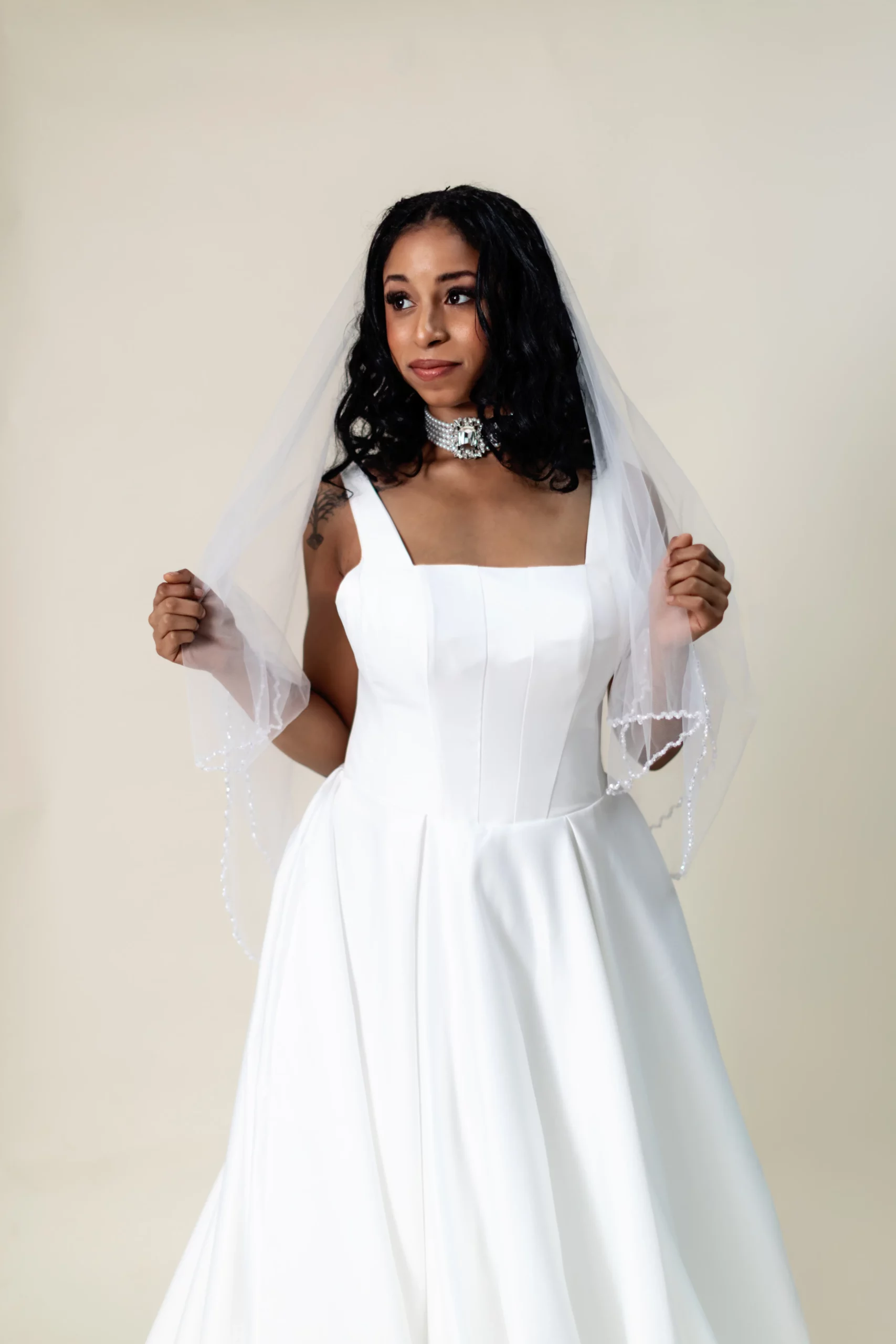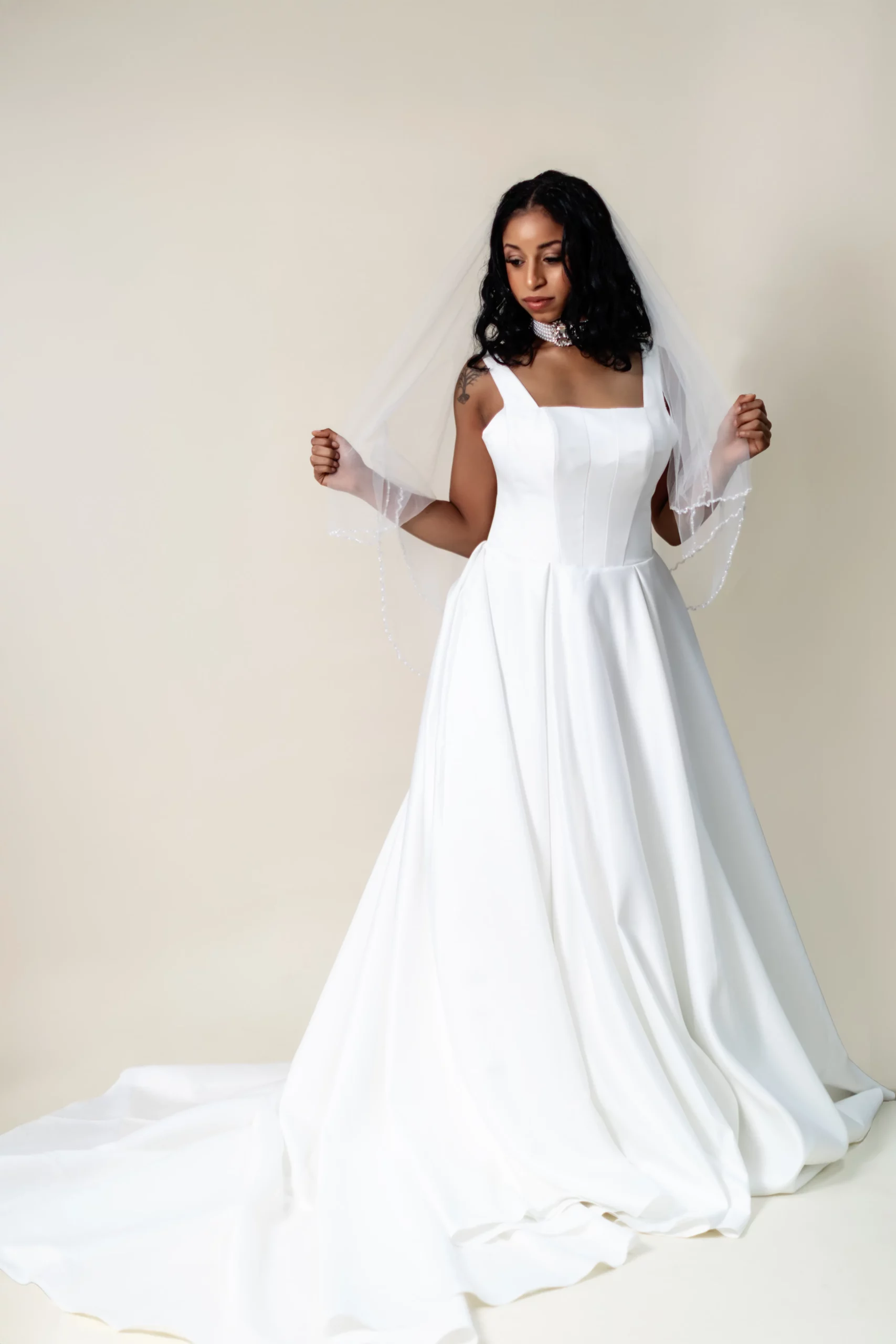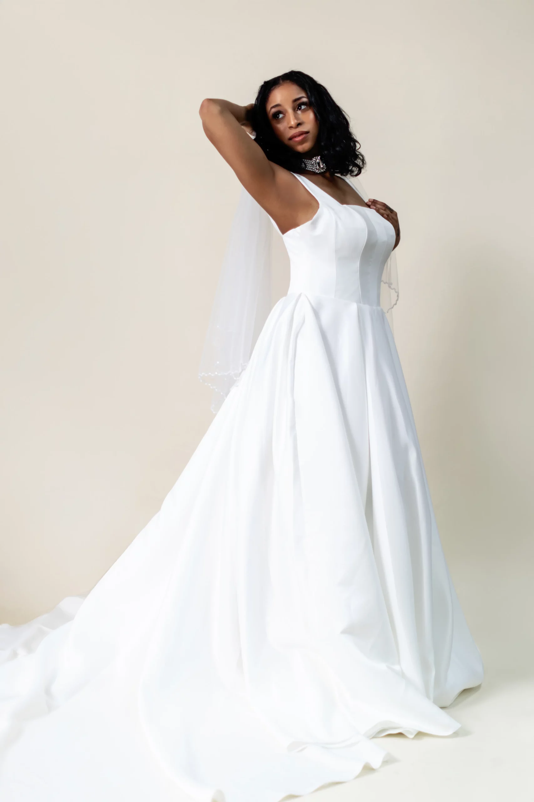 Crafted from luxurious satin, this ball gown features a structured bodice with a modern square neckline that flatters the shoulders and frames the collarbone beautifully. The full, dramatic skirt flows into a sweeping chapel train designed to create breathtaking movement down the aisle.