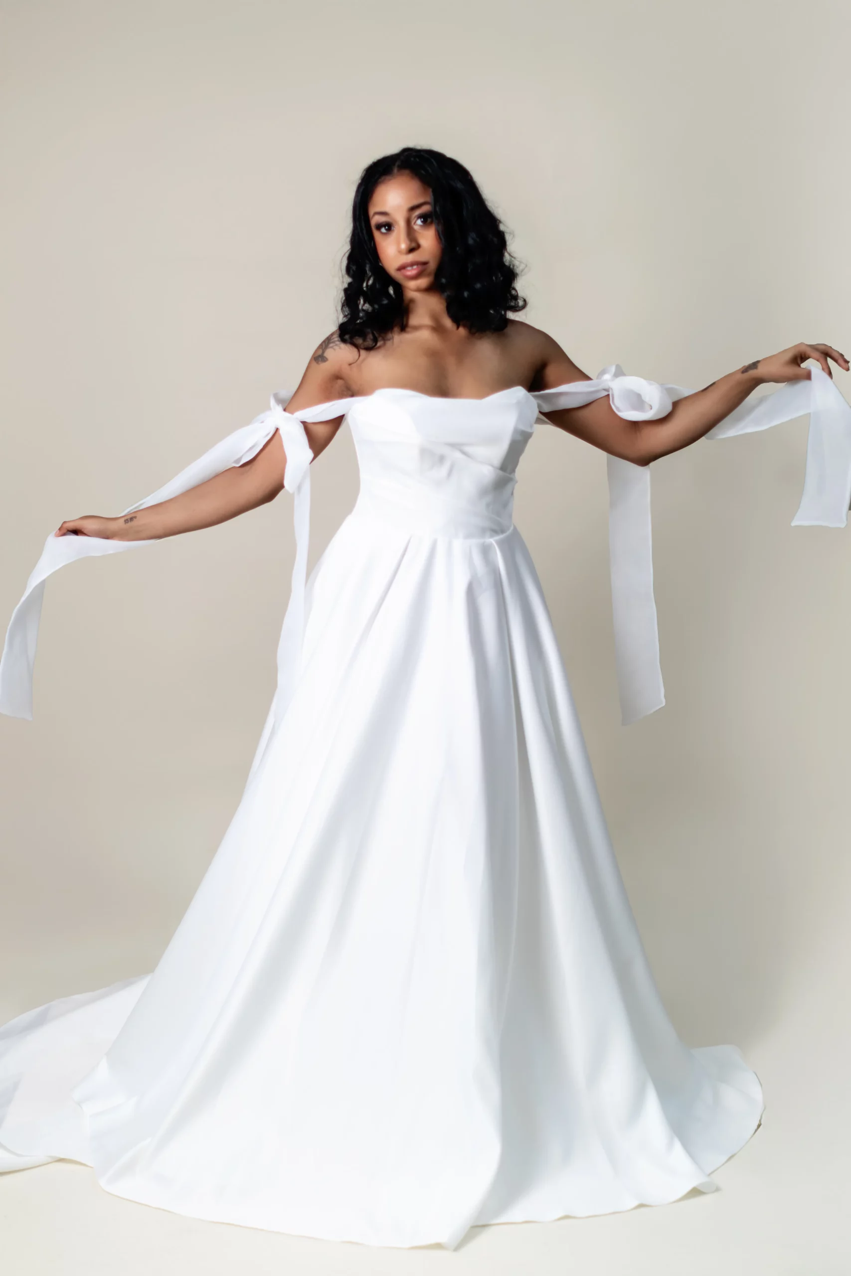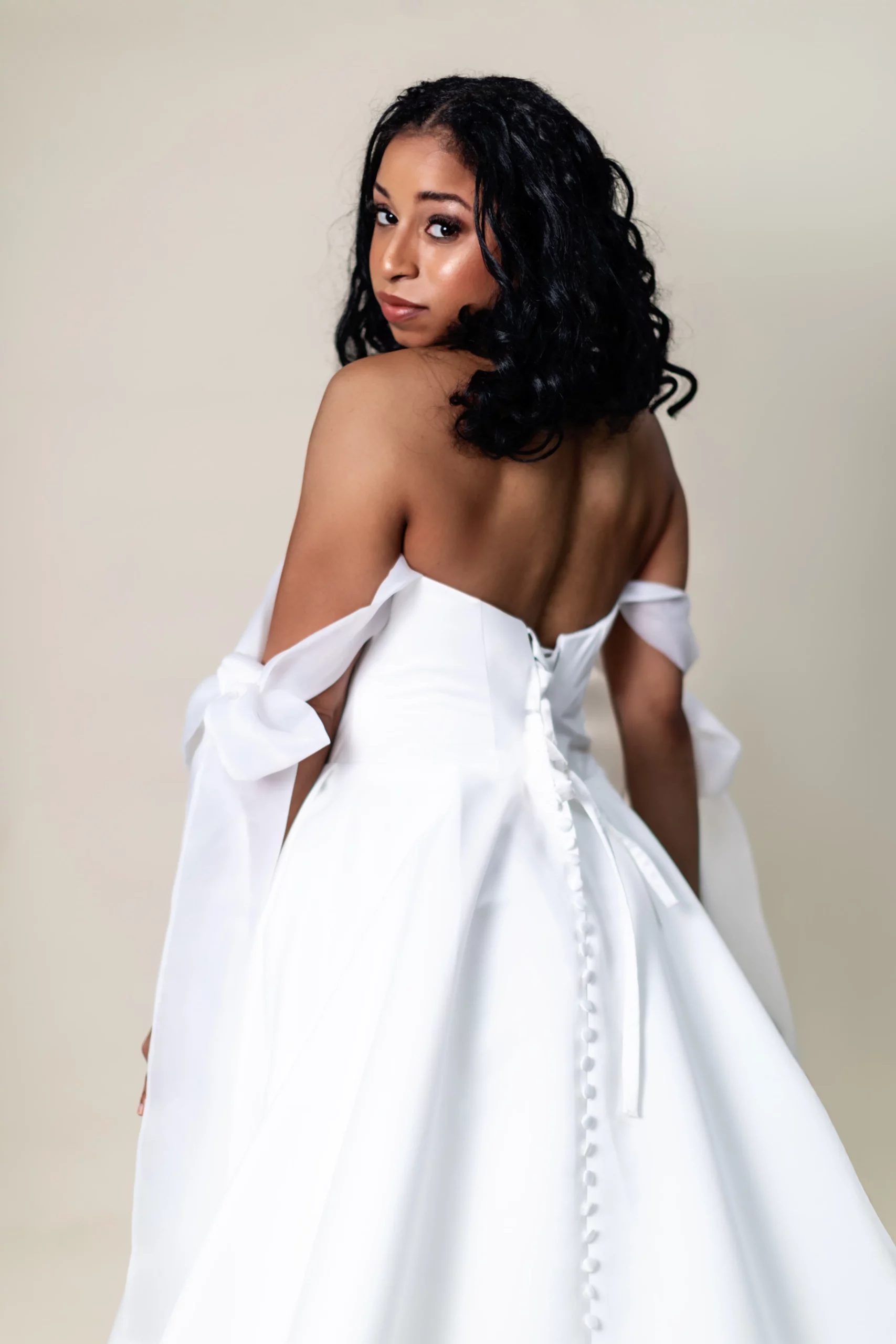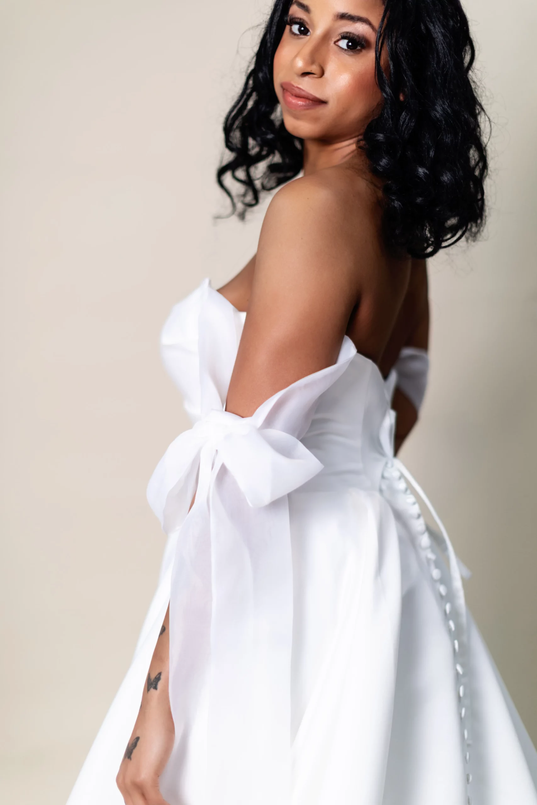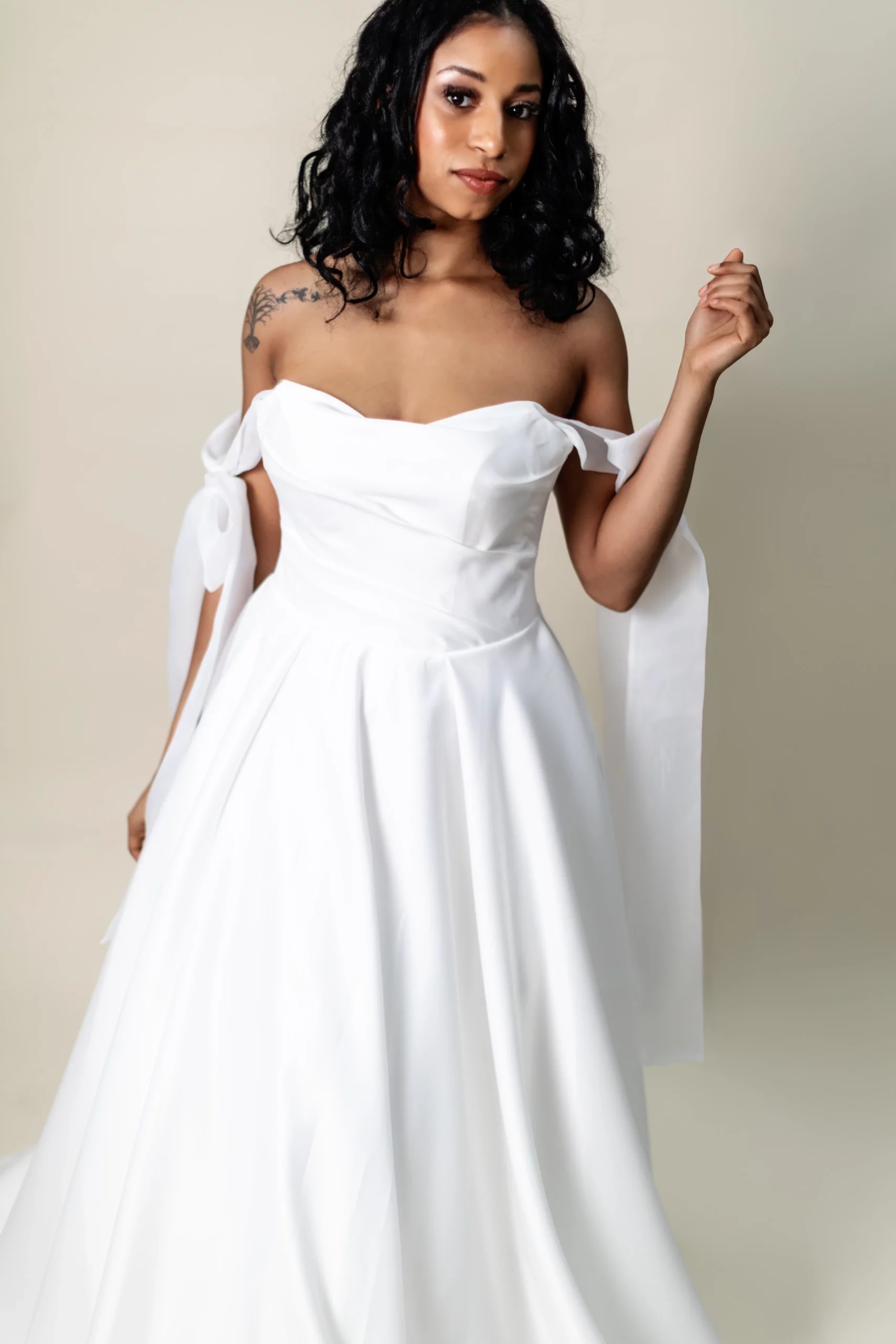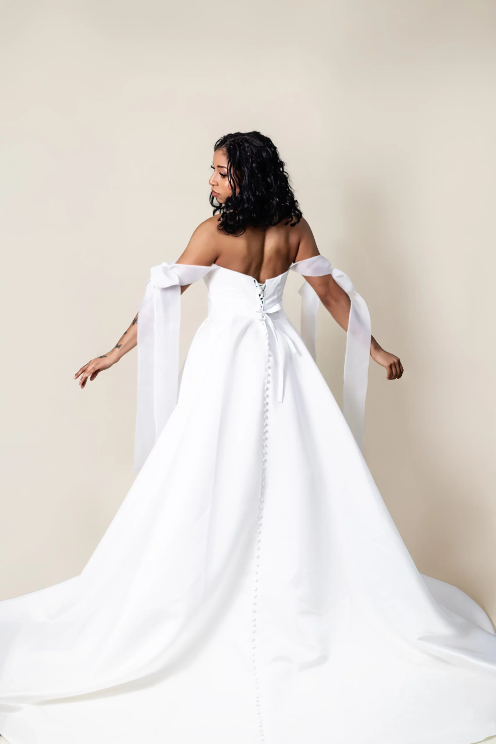 Kelly is the perfect blend of timeless elegance and modern romance. This A-line wedding gown features a lustrous satin finish that drapes beautifully, creating a refined and graceful silhouette. The soft sweetheart neckline adds femininity and charm, while the detachable chiffon bows at the shoulders give brides the freedom to choose between a playful, romantic look or a sleek, strapless style.