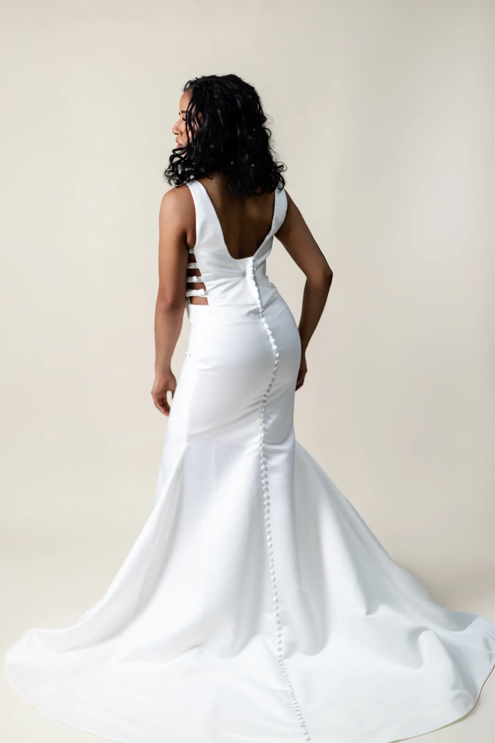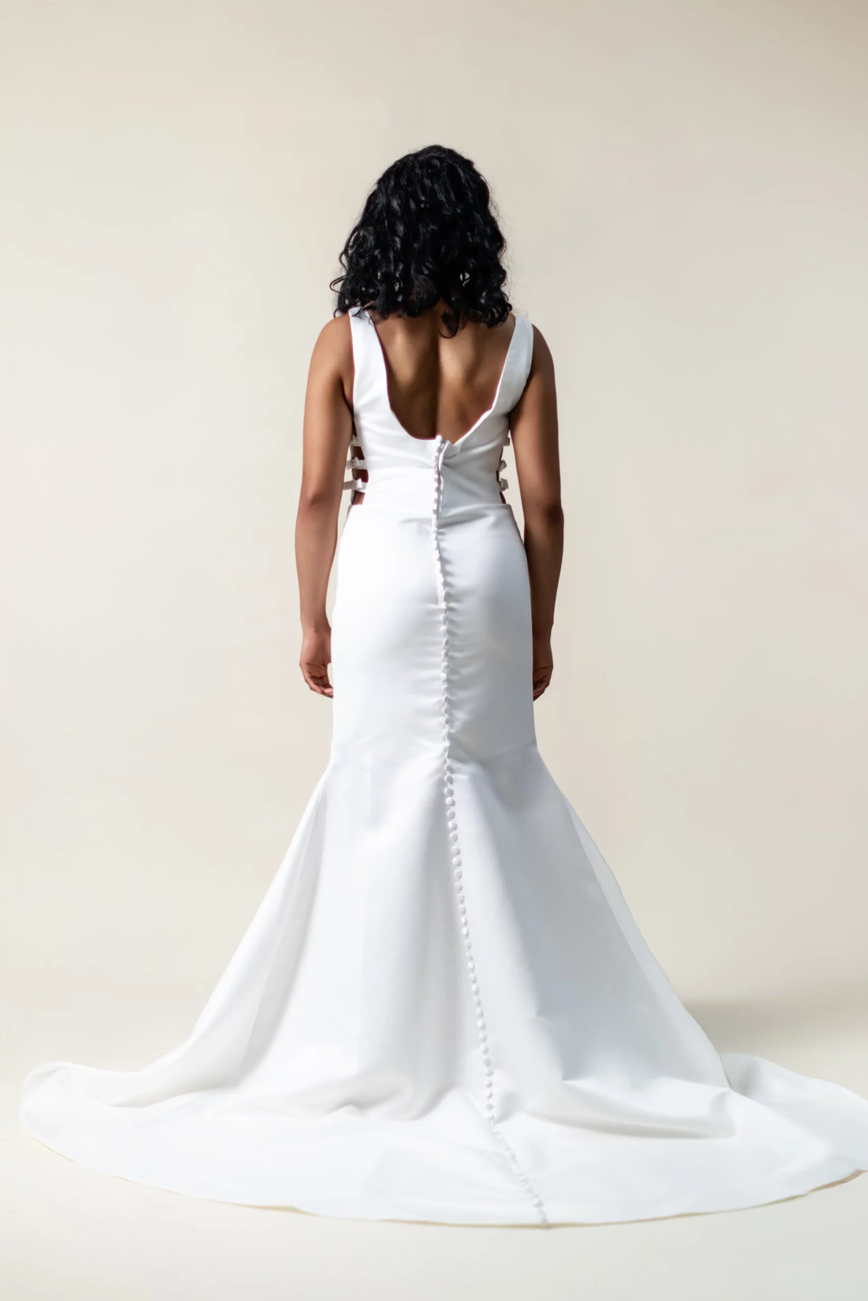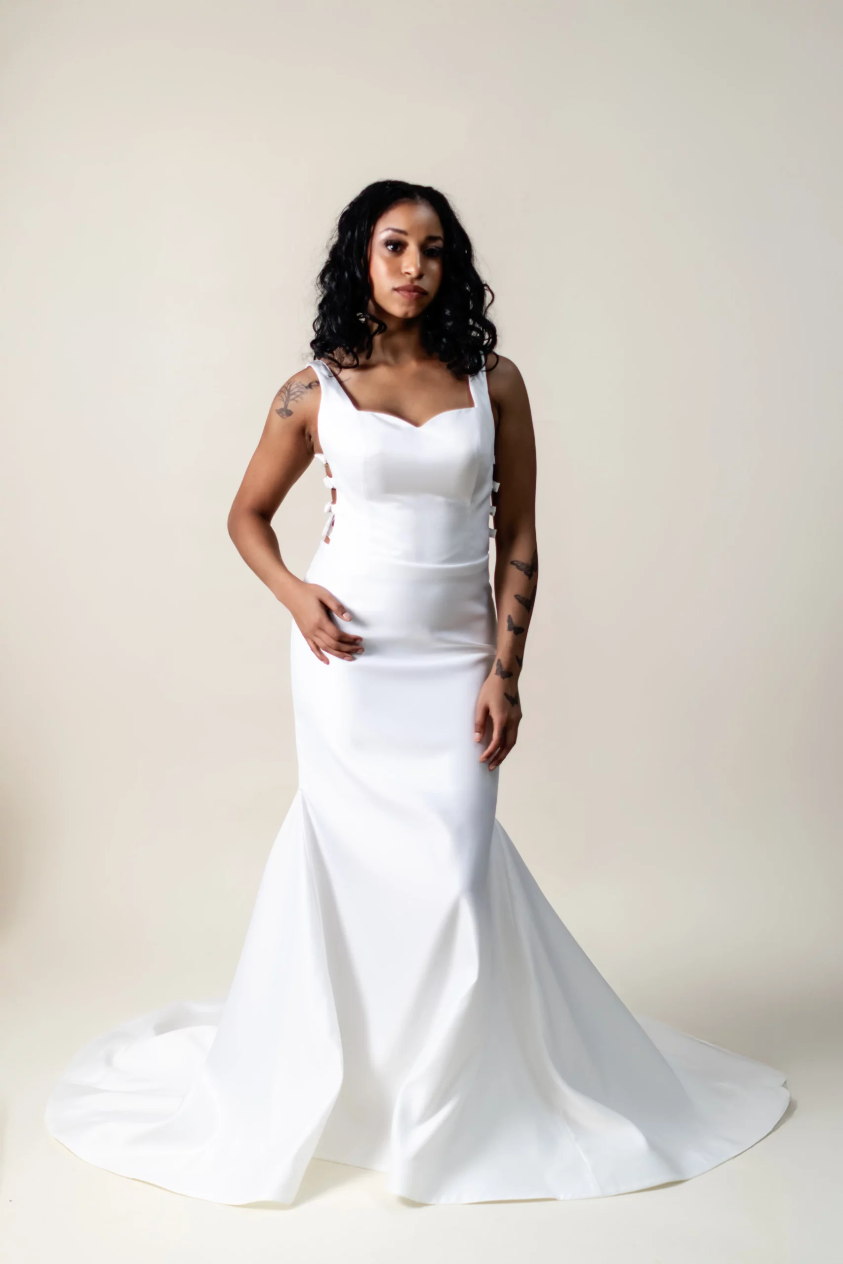 The square neckline with a slight sweetheart curve creates a romantic yet modern touch, while the open sides with delicate bow strap detailing add a unique, fashion-forward element. The back of the dress is finished with a row of covered buttons running down the train, offering a classic bridal detail that never goes out of style.