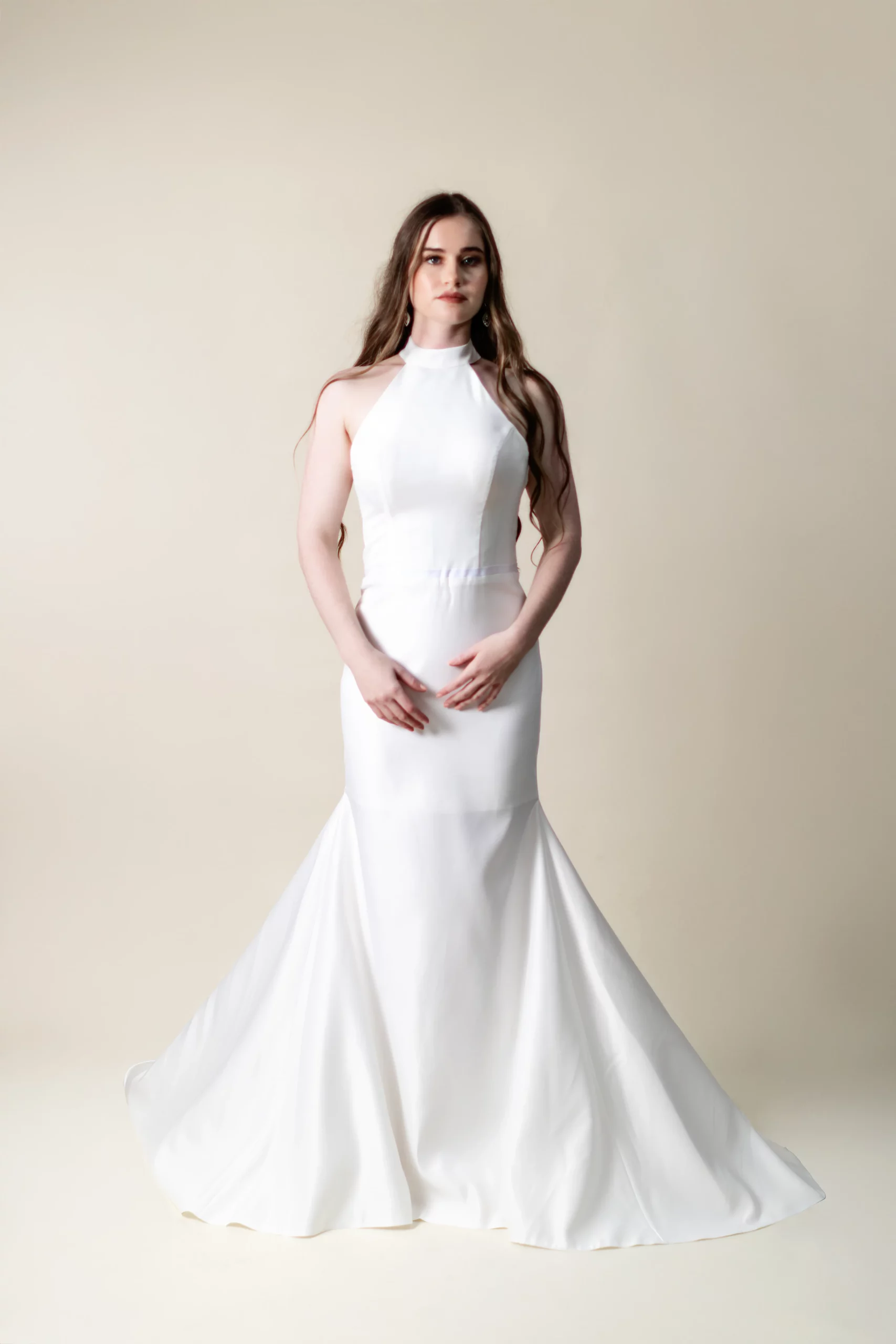 Crafted from rich, lustrous satin, Seraphina hugs the body in a flattering mermaid silhouette before flowing into a dramatic train. A row of satin-covered buttons trails from the waist to the hem, adding a timeless bridal touch.