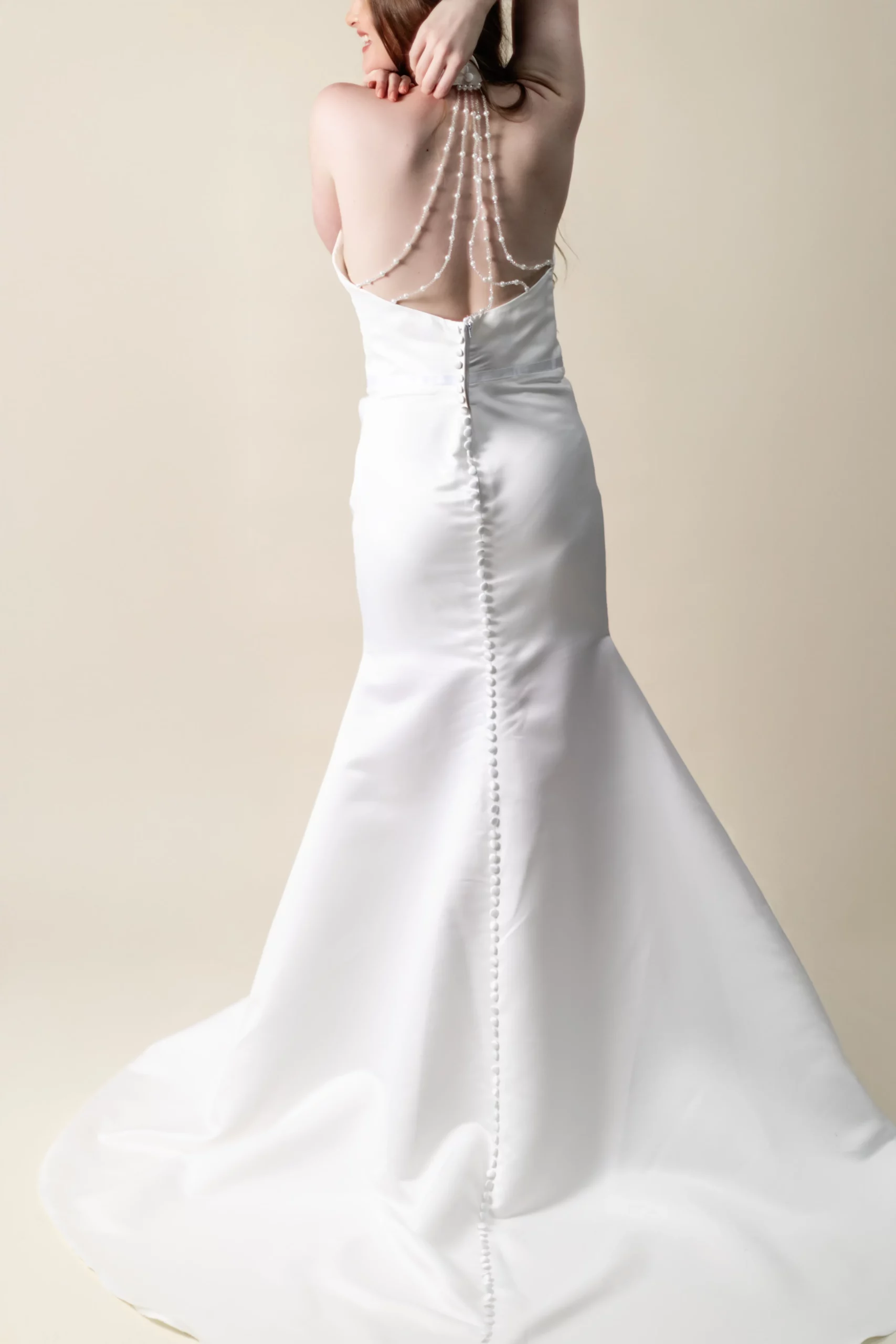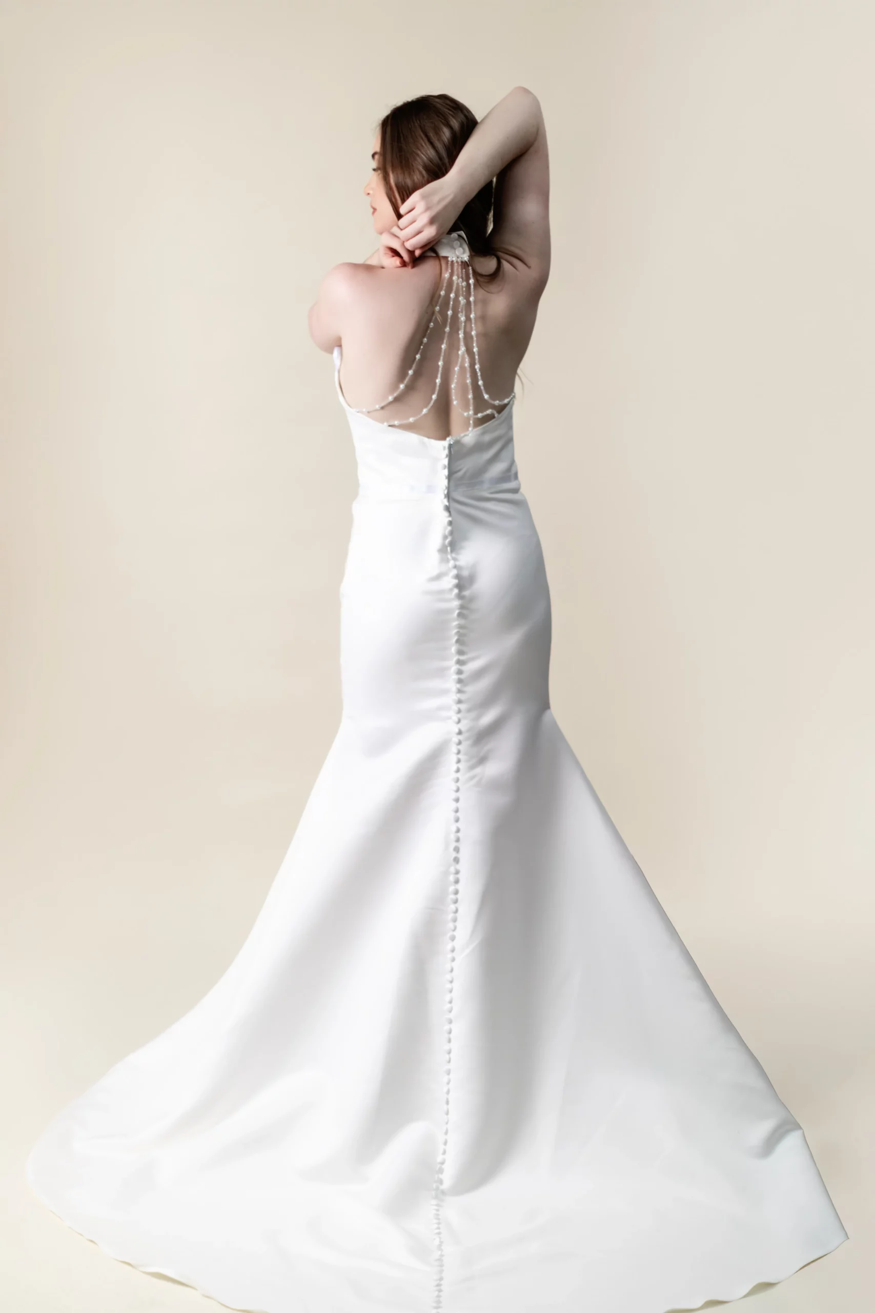 Seraphina is the embodiment of modern elegance with a touch of vintage romance. This halter neck satin wedding gown is designed for brides who appreciate clean lines, luxurious fabric, and unforgettable details. The sleek high-neck bodice elongates the figure, while the open back reveals a cascade of delicate pearl strands, draping gracefully for a show-stopping effect.