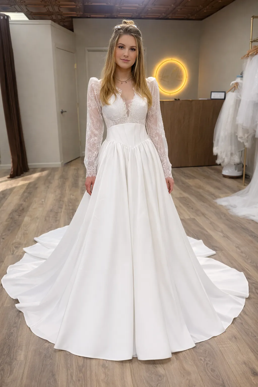 The gown features a delicate lace bodice with a plunging V-neckline, framed by sheer long sleeves that add refinement while maintaining an airy, ethereal feel. Intricate floral lace softly contours the bodice, blending romance with subtle structure for a flattering, feminine silhouette.
