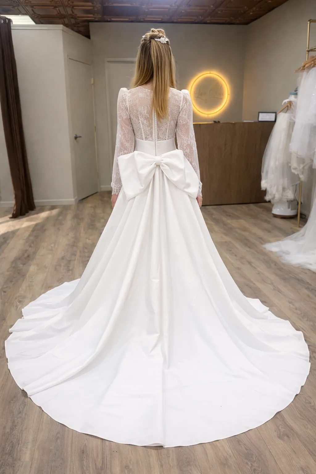 From the back, Sylvana reveals a breathtaking finishing touch, a detachable statement bow detail placed at the waistline, cascading gently into the skirt and train. This detail adds a touch of classic charm and creates a stunning focal point from behind, perfect for ceremony moments and timeless photographs.